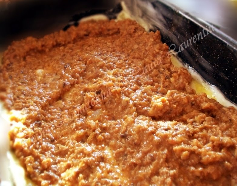 2. Deasupra de stratul de foaie se pune din nou un strat subtire de sos bechamel. Se continua cu un strat generos de sos ragu – click pentru reteta.