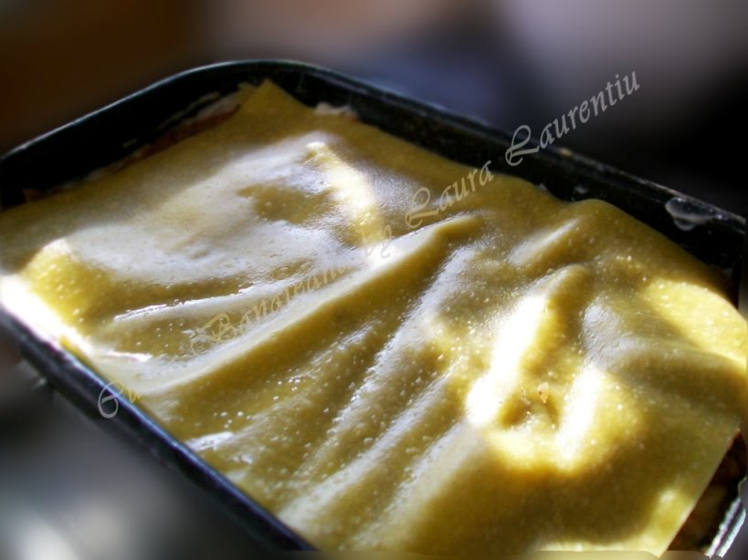 4. Se aseaza in tava ultimul strat de foi. Se acopera ultima strat de paste cu sosul bechamel pastrat.