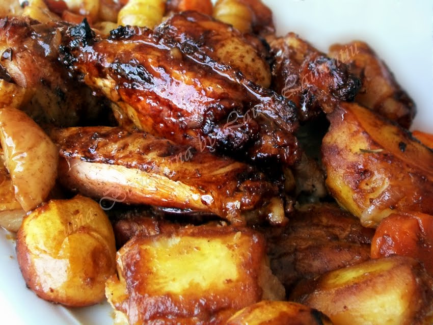 Si inca una, din editia a doua, de aceasta data cu pui si porc, alaturi de cartofi si dovlecei umpluti: