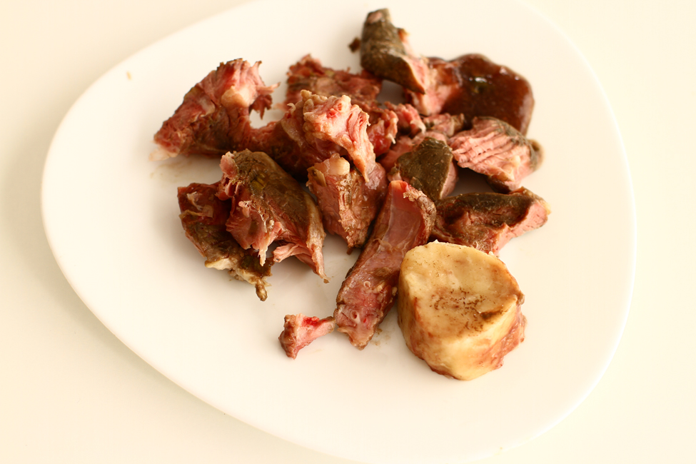 După ce toate s-au rumenit, am turnat în tavă apă clocotită și am lasat tava să fiarbă pe plită până când toate aderențele delicioase prinse de fundul ei s-au dizolvat în apă. Apoi am transferat totul, carne, legume și zeamă, într-o oală, am adăugat 1 frunză de dafin, câteva rămurele de cimbru și de tarhon, legate cu sfoară de bucătărie (da, Bună-mea se pare că știa ce e un bouquet garni, chiar dacă nu îl numea așa) și am turnat apă fierbinte până s-au acoperit toate bine. Am pus oala pe foc foarte mic, să fiarbă fără niciun freamăt la suprafață, cam șase ceasuri, până când carnea pur și simplu a căzut de pe oase.